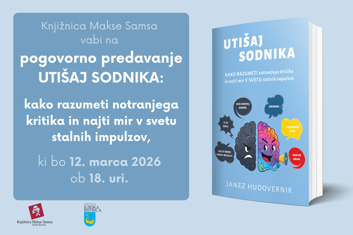 Knjižnica Makse Samsa vas vabi na pogovorno predavanje in predstavitev knjige Utišaj sodnika: kako razumeti notranjega kritikain najti mir v svetu stalnih impulzov, ki bo 12. marca 2026 ob 18. uri.