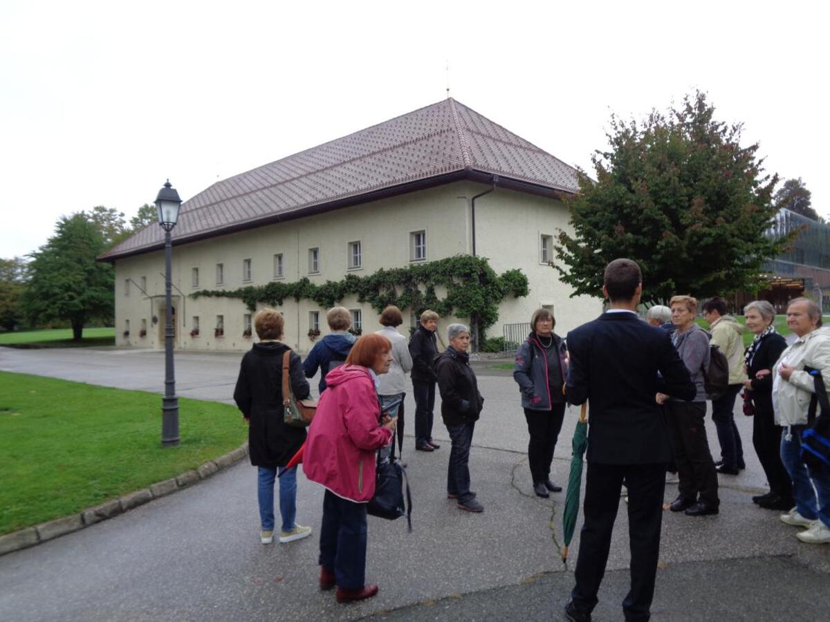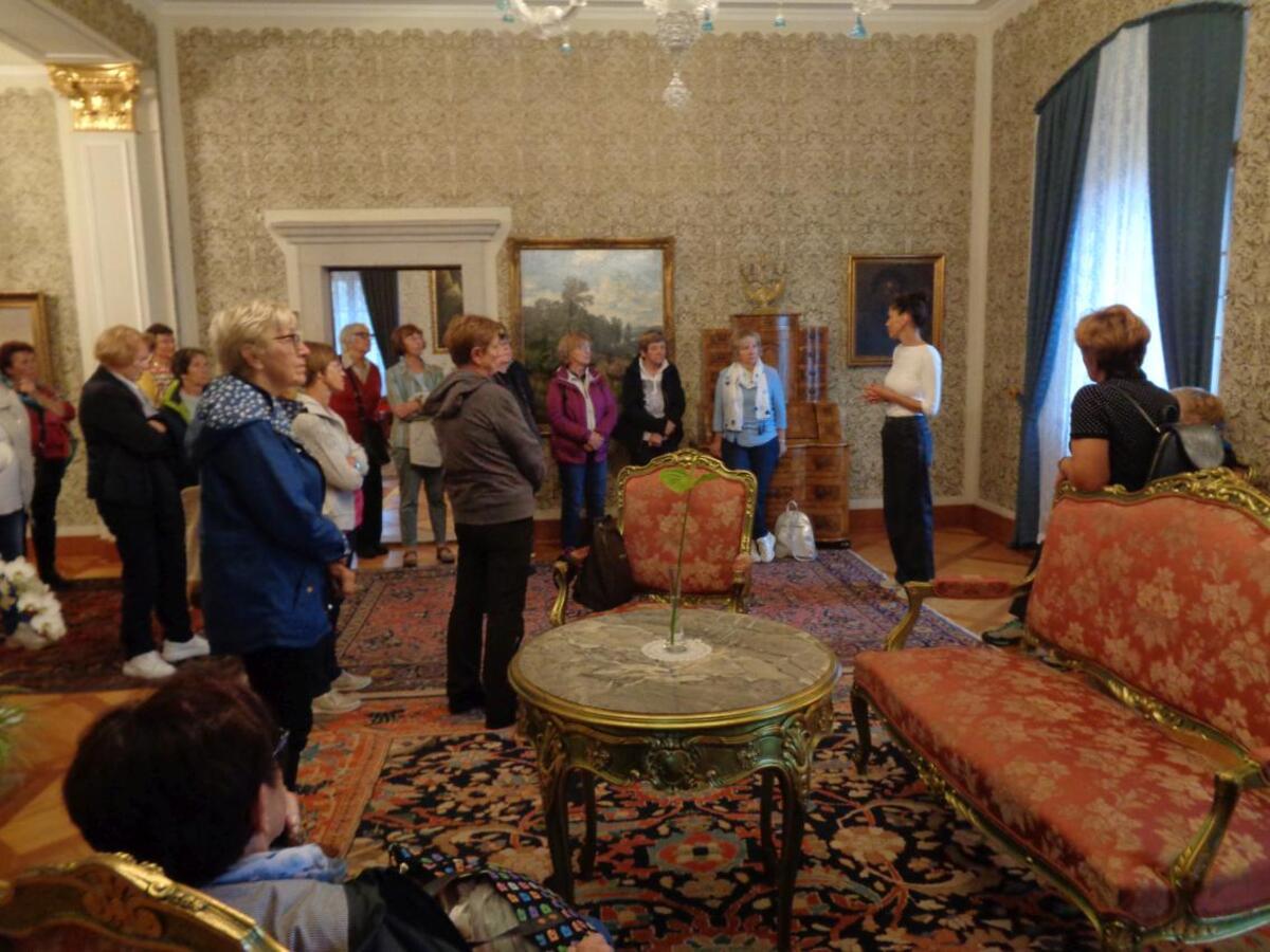 Po kosilu pa nas je čakal še ogled gradu Strmol, ki je eden najstarejših na tem prostoru, saj se ga prvič omenja leta 1287. Tudi ta grad je menjal veliko lastnikov. Danes je del protokolarnih objektov, a je v njem možna tudi hotelska nastanitev ali uporaba prostorov. Ljubezniva vodička Barbara nas je popeljala med nadstropji, kjer smo si lahko ogledali kopalnice, spalnice, dnevne prostore, lestence, ogledala, knjižnice, jedilnice, pa tudi omare in omarice s skrivnostnimi predalčki za pomembnejše predmete. Seveda pogovor ni obšel zadnjih lastnikov, industrialca Rada Hribarja z ženo Ksenijo, katerih žalosten konec je v imenitni knjigi To noč sem jo videl opisal pisatelj Drago Jančar.