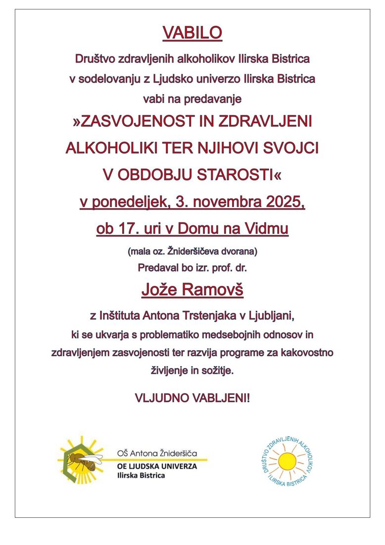 Predavanje ZASVOJENOST IN ZDRAVLJENI ALKOHOLIKI TER NJIHOVI SVOJCI V OBDOBJU STAROSTI
