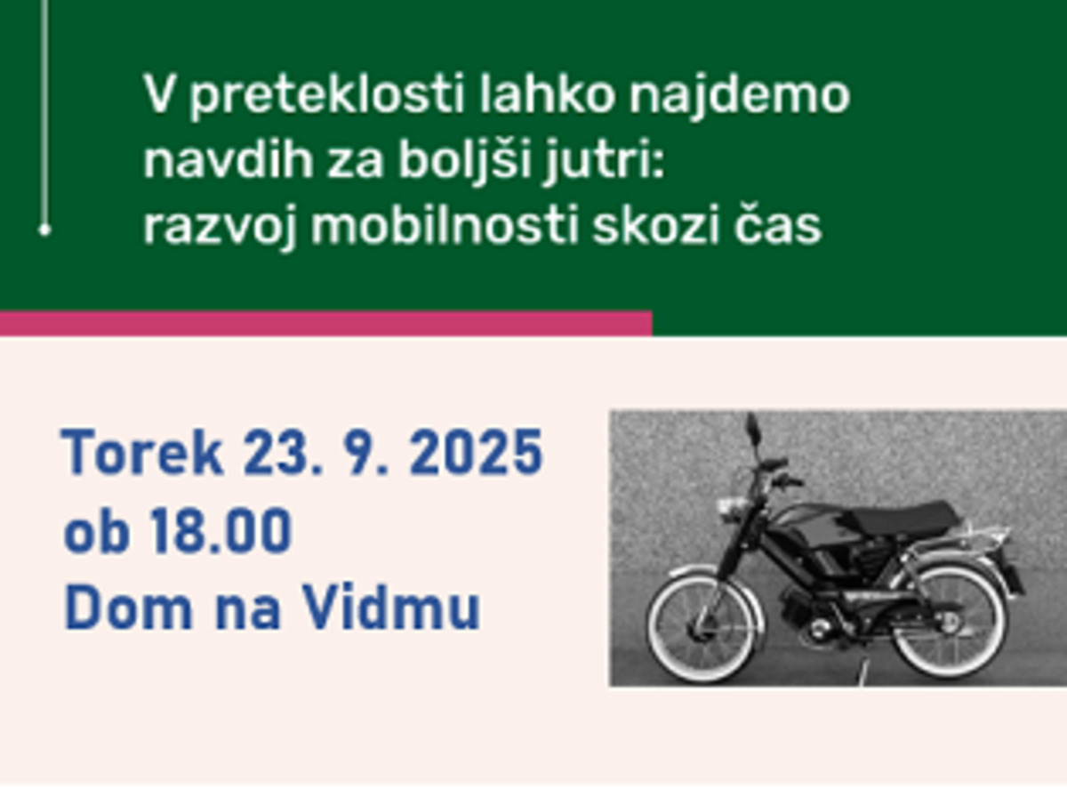 Vljudno vabljeni na otvoritev razstave V preteklosti lahko najdemo navdih za boljši jutri: razvoj mobilnosti skozi čas, ki bo v torek 23. 9. 2025, ob 18.00 v Žnideršičevi (mali) dvorani Doma na Vidmu.