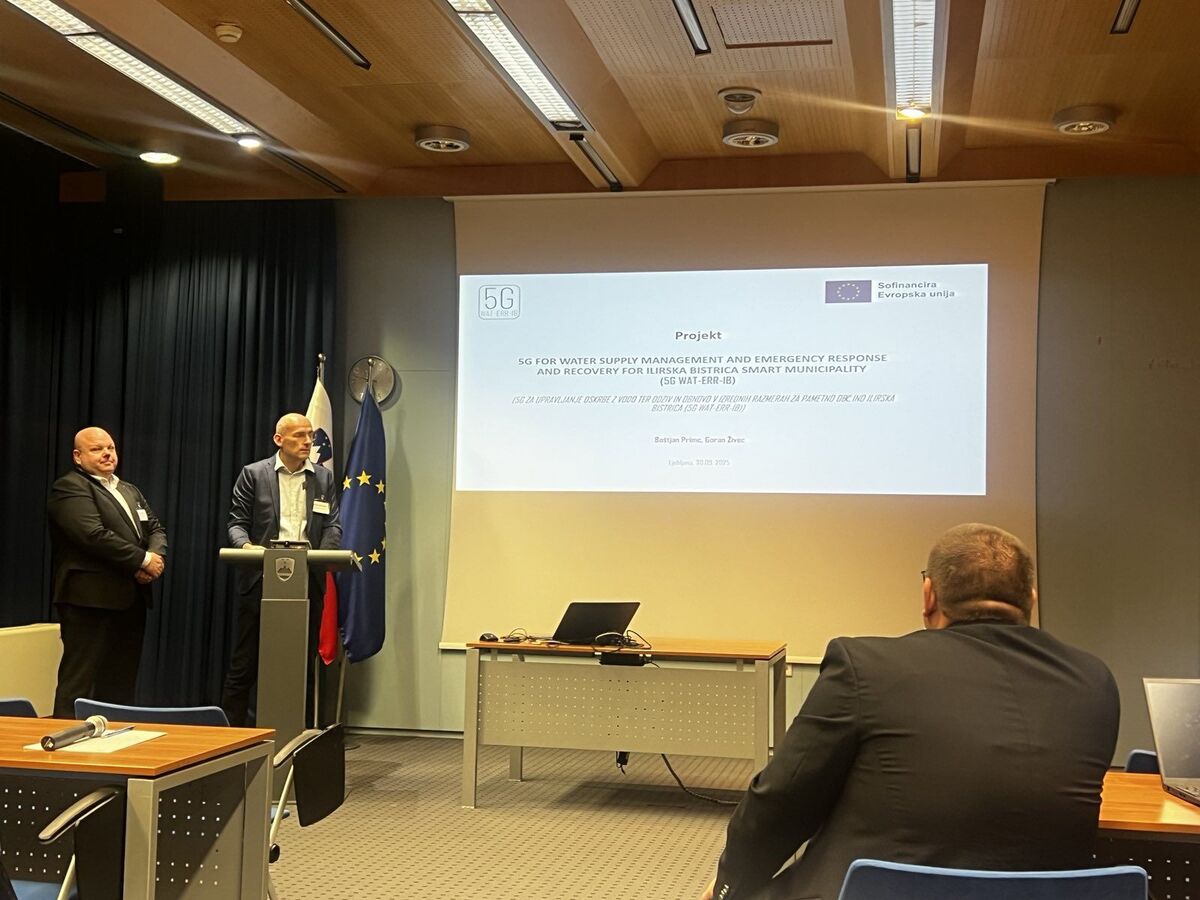 Boštjan Primc iz Občine Ilirska Bistrica in Goran Živec, direktor podjetja Vahta, d. o. o., sta včeraj na posvetu, ki ga je organiziralo Ministrstvo za digitalno preobrazbo, predstavila projekt 5G WAT-ERR-IB za izgradnjo napredne brezžične infrastrukture pete generacije (5G), s katero bo občina Ilirska Bistrica izboljšala odzivanje ob naravnih in drugih nesrečah ter uveljavila boljši nadzor nad porabo vode v občini.