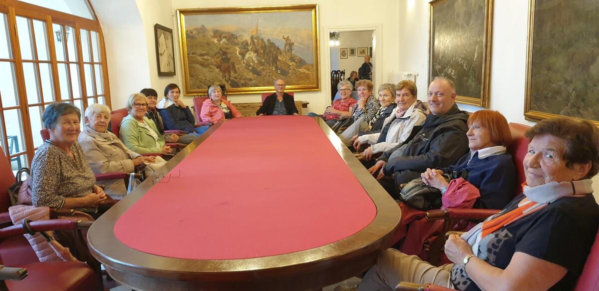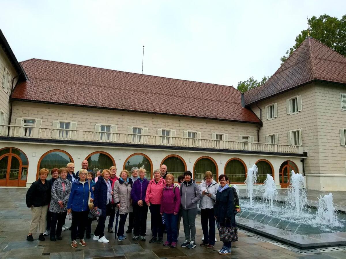 Po kosilu pa nas je čakal še ogled gradu Strmol, ki je eden najstarejših na tem prostoru, saj se ga prvič omenja leta 1287. Tudi ta grad je menjal veliko lastnikov. Danes je del protokolarnih objektov, a je v njem možna tudi hotelska nastanitev ali uporaba prostorov. Ljubezniva vodička Barbara nas je popeljala med nadstropji, kjer smo si lahko ogledali kopalnice, spalnice, dnevne prostore, lestence, ogledala, knjižnice, jedilnice, pa tudi omare in omarice s skrivnostnimi predalčki za pomembnejše predmete. Seveda pogovor ni obšel zadnjih lastnikov, industrialca Rada Hribarja z ženo Ksenijo, katerih žalosten konec je v imenitni knjigi To noč sem jo videl opisal pisatelj Drago Jančar.