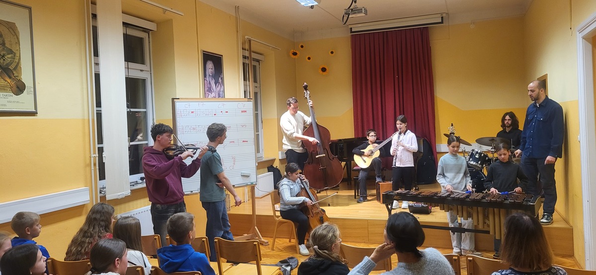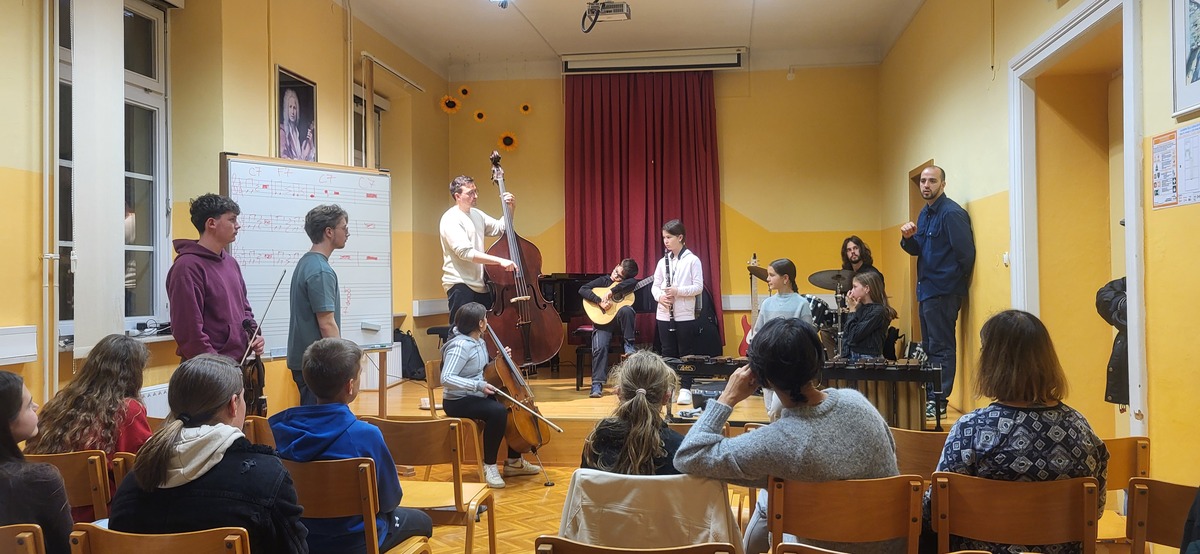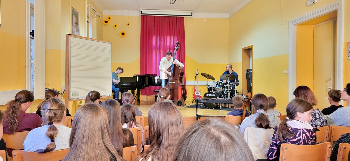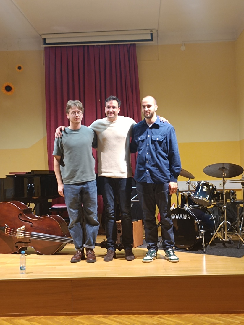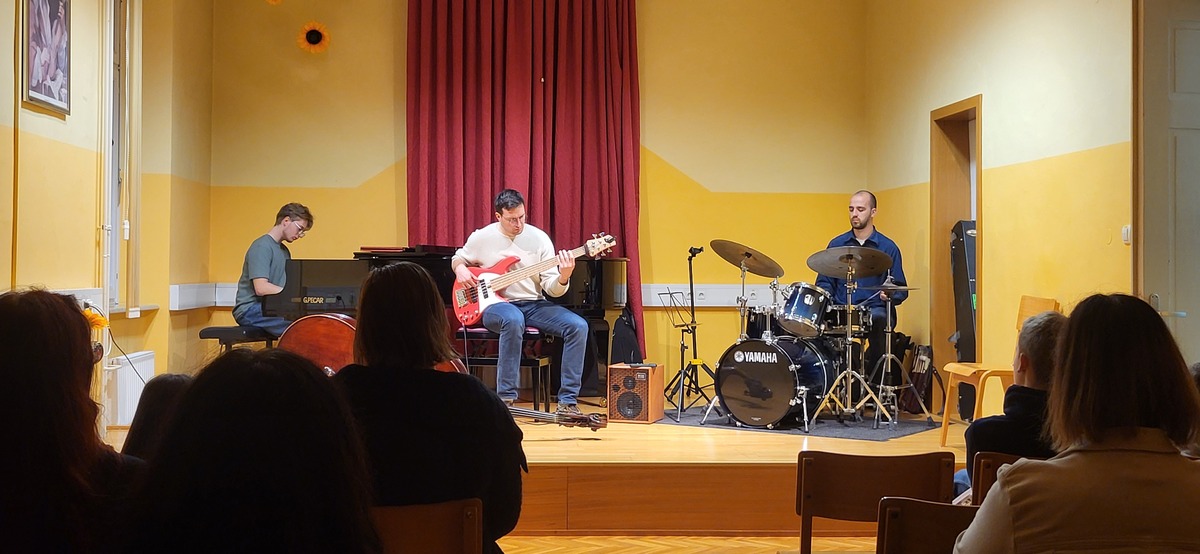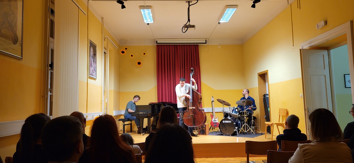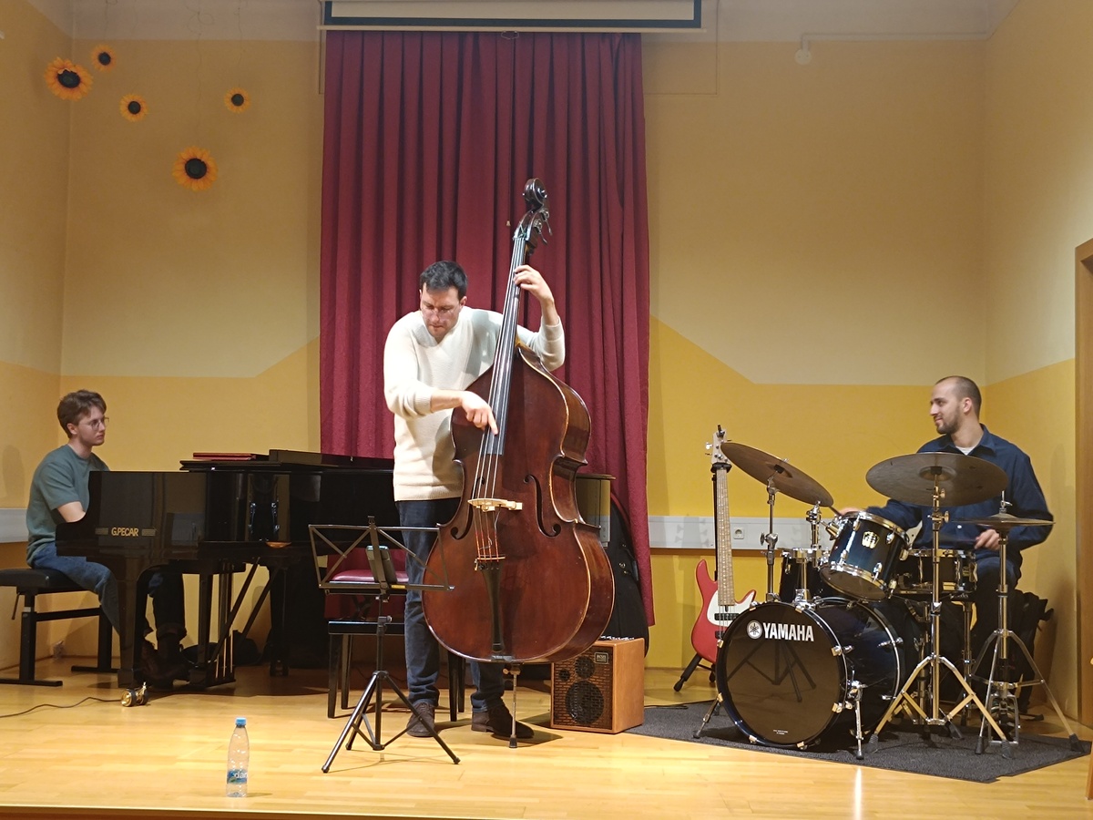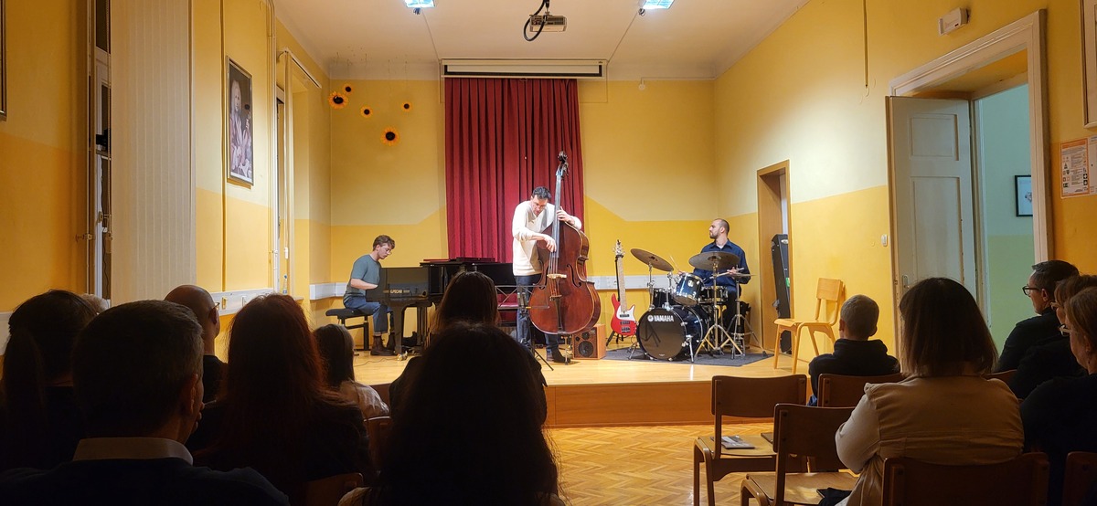 V ponedeljek, 10. novembra 2025, se je dvorana domače glasbene šole spremenila v mali jazz oder, na katerem so se klavirju pridružili kontrabas, bas kitara in baterija bobnov.