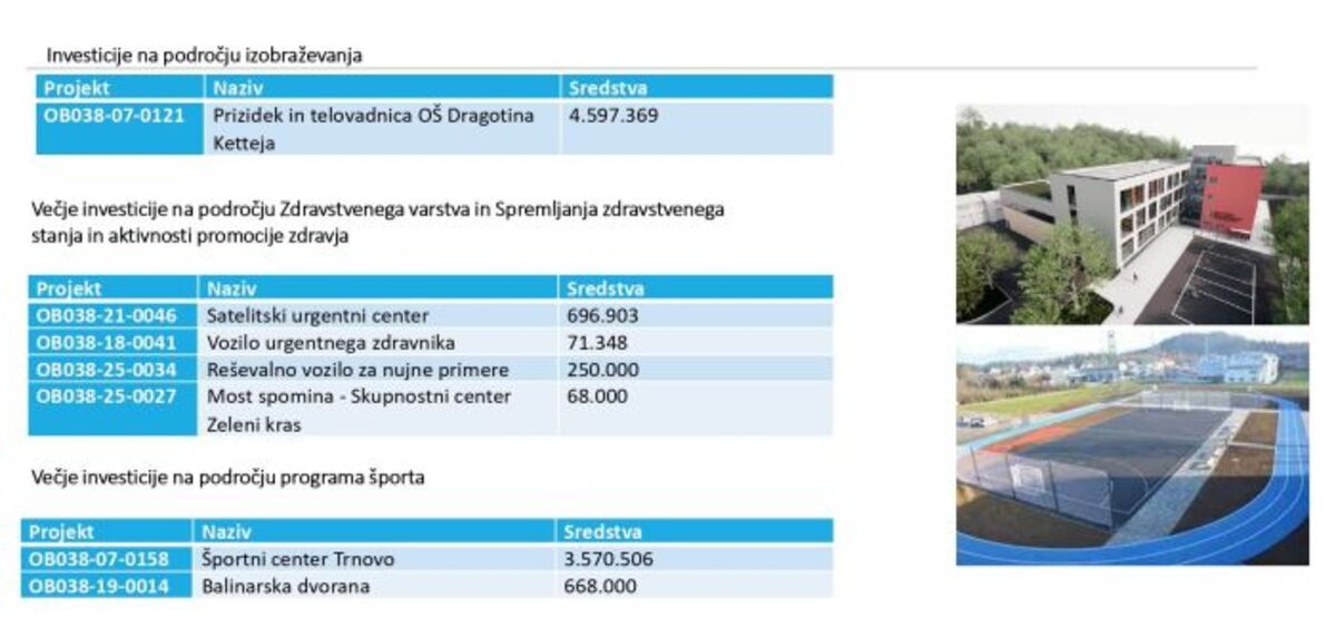 Občinski svet Občine Ilirska Bistrica je na 23. redni seji s 16 glasovi za in štirimi proti potrdil občinski proračun za leto 2026. Največja investicija v občini je gradnja telovadnice in prizidka pri OŠ Dragotina Ketteja, leto 2026 pa bodo zaznamovale tudi ureditev športnega centra Trnovo in gradnja balinarske dvorane, gradnja gasilskega doma Podgrad in energetska sanacija telovadnice pri tamkajšnji šoli, obsežnejše prenove več lokalnih cest, investicije v zdravstvo, priprava dokumentacije za gradnjo soseske Pod hribom ter priprave na izvedbo projekta vodooskrbe Istre in krasa.