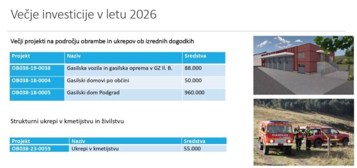 V Podgradu bo izvedena obsežna energetska sanacija telovadnice pri osnovni šoli. V proračunu je za to naložbo rezerviranih dobrih 1,2 milijona evrov, občina je projekt prijavila na razpis Ministrstva za okolje, podnebje in energijo, kjer računa na sofinanciranje približno 20 % vrednosti naložbe. V Podgradu bo v letu 2026 potekala tudi gradnja gasilskega doma na ključ. Občina je za gradnjo rezervirala 960.000 evrov.