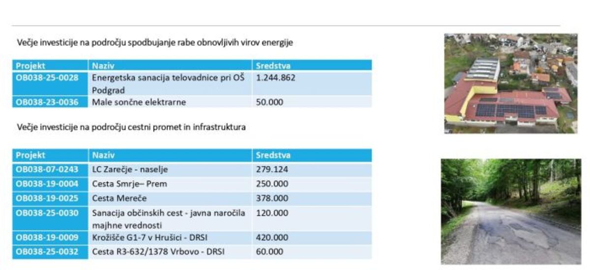 V letu 2026 bo izvedenih več obsežnejših prenov cestne infrastrukture. Za cesto skozi Zarečje je v proračunu zagotovljenih 280.000 evrov, za cesto med Smrjami in Premom 250.000, za cesto v Merečah pa 378.000 evrov. Za ostale sanacije občinskih cest je v proračunu 120.000 evrov.