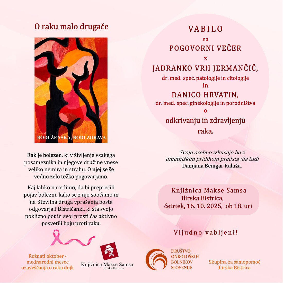 V četrtek, 16. oktobra 2025, je bil v Knjižnici Makse Samsa Ilirska Bistrica, v okviru Rožnatega oktobra, organiziran odmeven pogovorni večer z naslovom O raku malo drugače. Dogodek je izpostavil ključen pomen preventive, ozaveščanja in solidarnosti. Uvodoma je polno knjižnico obiskovalcev nagovorila direktorica knjižnice, mag. Damijana Hrabar. Poudarila je, da je dogodek opomin na nujnost medsebojne podpore in skrbi za lastno zdravje. Z globokim spoštovanjem je spomnila, da je bil večer posvečen tudi sodelavki Tadeji, ki je bitko z boleznijo pred kratkim izgubila.