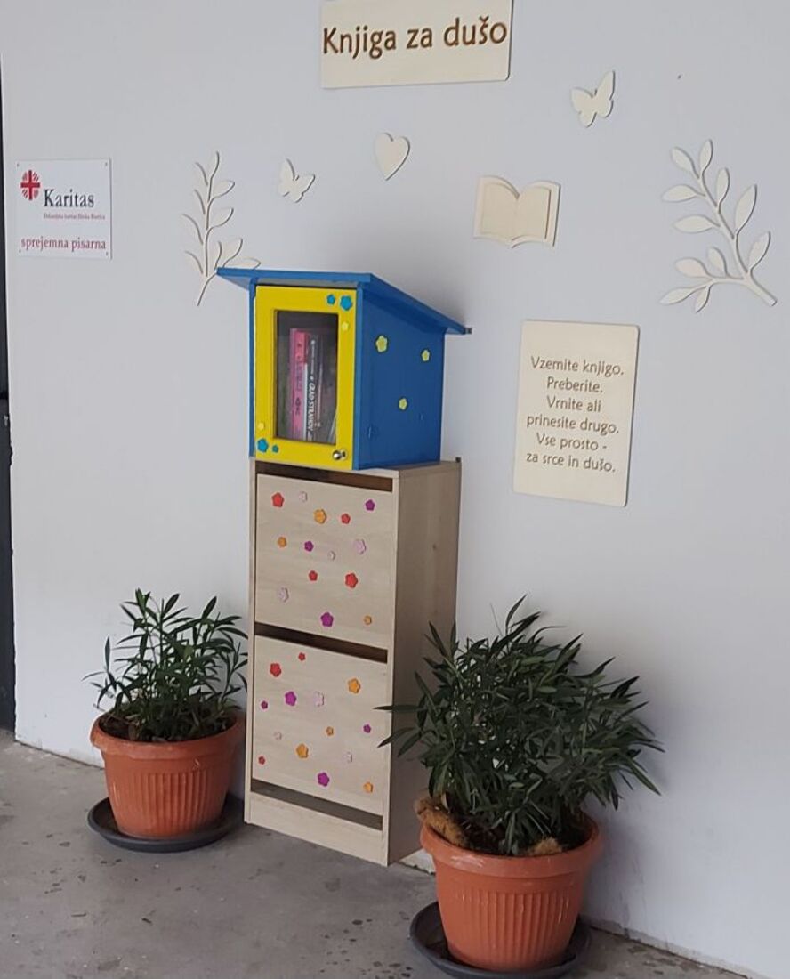 V Dekanijski karitas smo se odločili, da prejemnikom poleg hrane, ki jo zagotavlja EU, ponudimo tudi hrano za dušo. Postavili smo leseno hiško za izmenjavo knjig, t. i. malo knjižno hiško, kjer lahko vsakdo vzame knjigo ali pusti svojo.