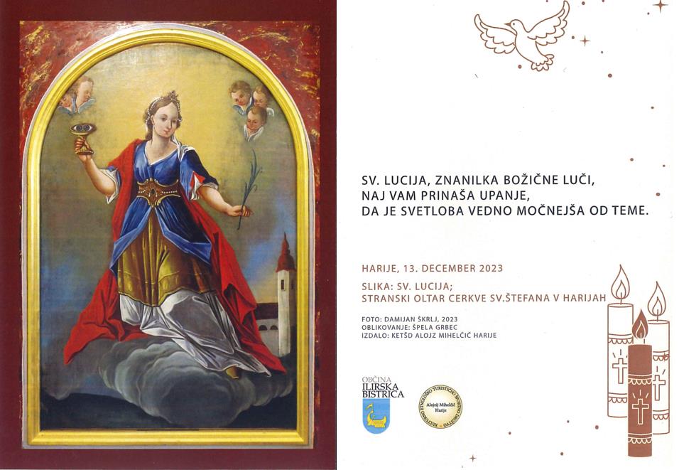 Lucijina zgodba je navdihnila številne pisatelje in pesnike. Njeno mučeništvo je vplivalo na velikega Danteja. Njeni atributi so dvojni križ, knjiga, palma, svetilka, sveča, plamenica, včasih nosi na pladnju dvoje oči. Eno izmed takšnih upodobitev najdemo na levem stranskem oltarju v harijski cerkvi in prav ta je lansko leto našla svoje mesto na priložnostni podobici.