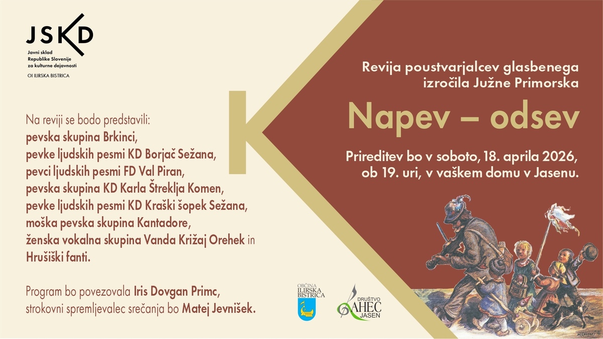 Javni sklad za kulturne dejavnosti – Območna izpostava Ilirska Bistrica in Društvo Ahec Jasen vabita na območno revijo poustvarjalcev glasbenega izročila Južne Primorska Napev – odsev.